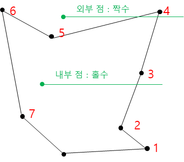 직선과 만나는 점의 개수가 짝수면 점이 다각형 외부에 존재한다는 뜻이고 홀수면 점이 다각형 내부에 존재한다는 뜻이다.