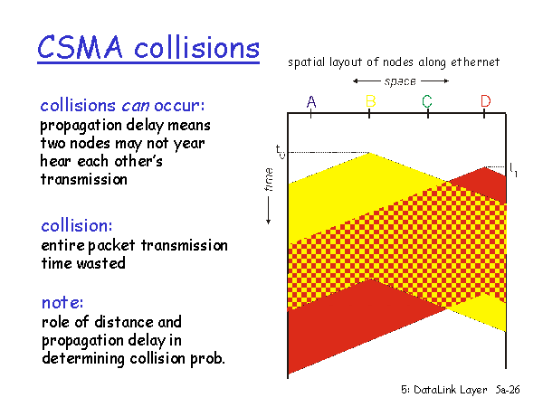 그러나 충돌히 여전히 일어날 수 있다. 만약 전파 지연이 발생하면 두 노드는 서로의 전송을 알 수 없을 수 있다.