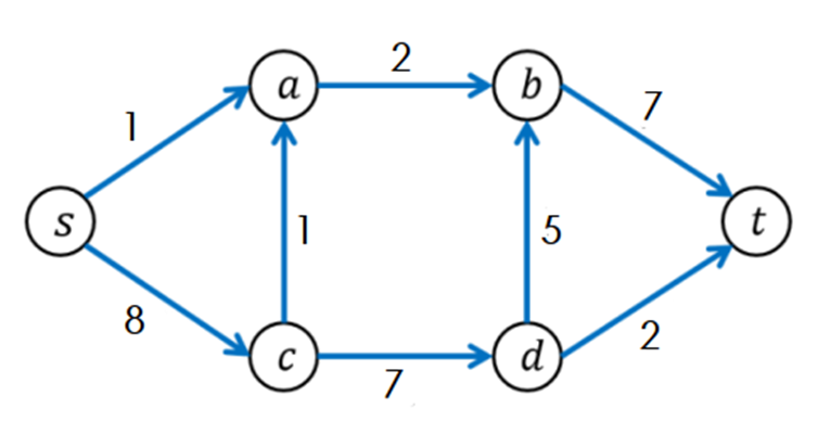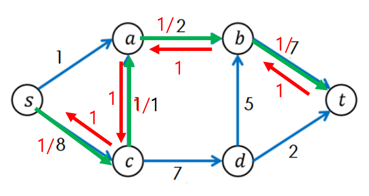 이는 다음 그림을 통해 이해하는 편이 빠르다. 다음 그래프에서 s->c->a->b->t에 대한 경로를 먼저 찾았다고 하자.