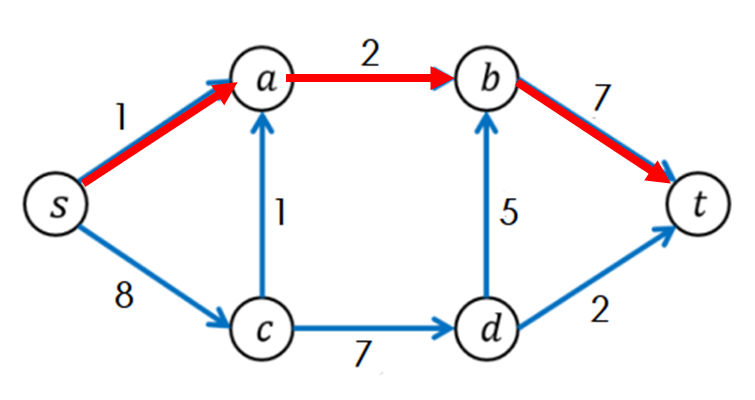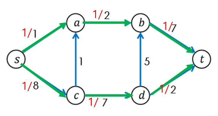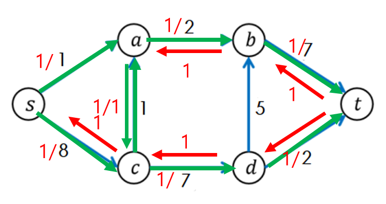 s->a->b->t에 해당하는 경로를 찾았다면 경로에 포함된 간선의 남은 용량들 중 가장 작은 값인 1만큼 흘려보내준다.
