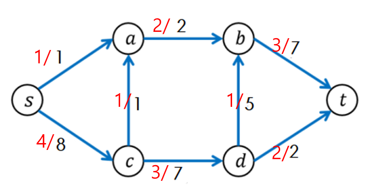 보다싶이 s->c->a->b->t 경로로 유량을 1만큼 더 흘려보낼 수 있다. 이는 반복을 계속하면 될 것이다.