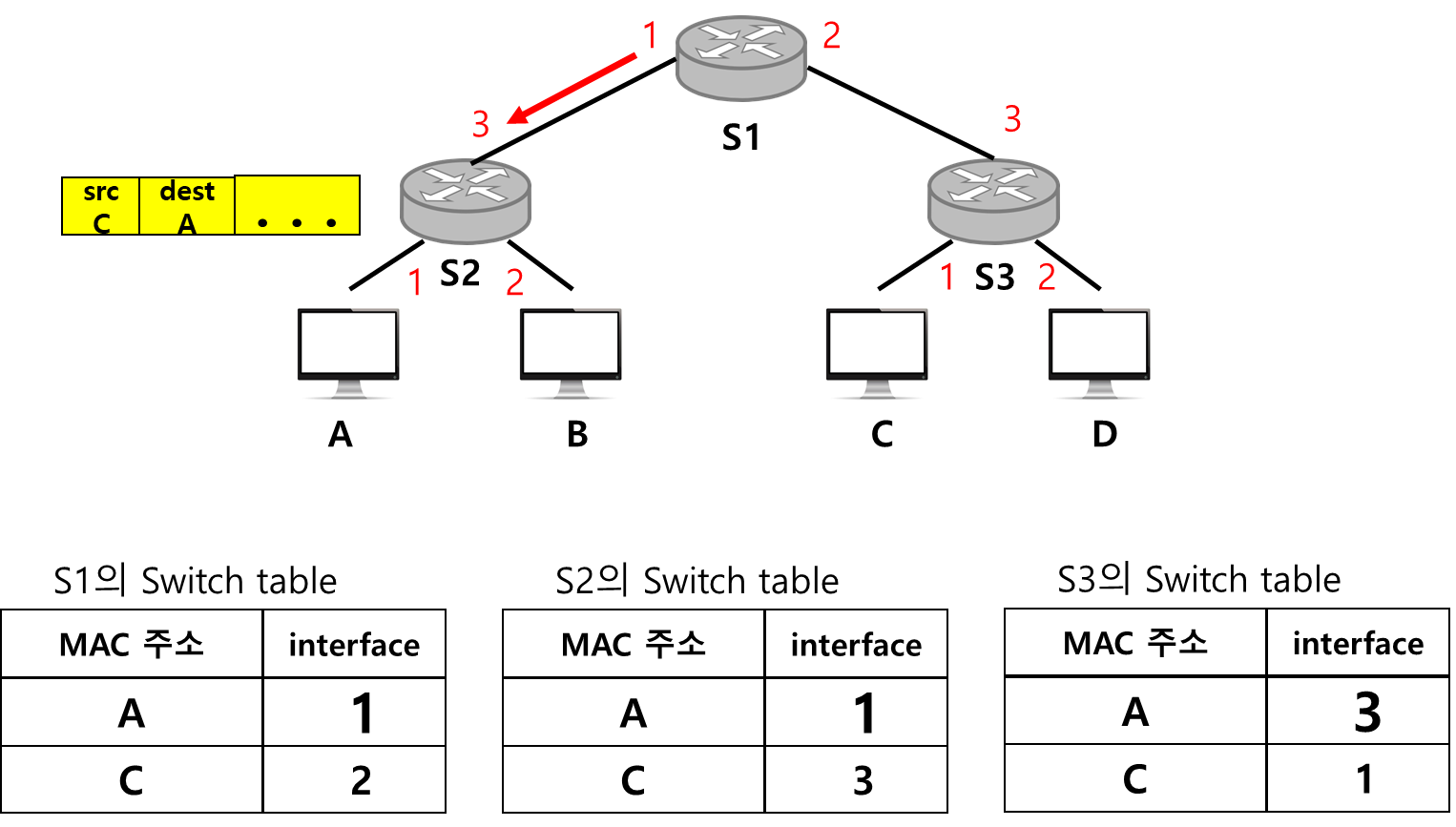 S3 스위치로 보내고 S3의 스위치 테이블에 기록된다.