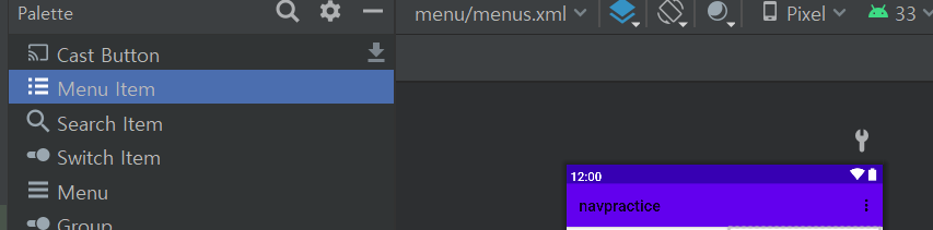 bottomNavigationView를 선택하고 common attributes에 보면 menu 버튼이 존재한다.