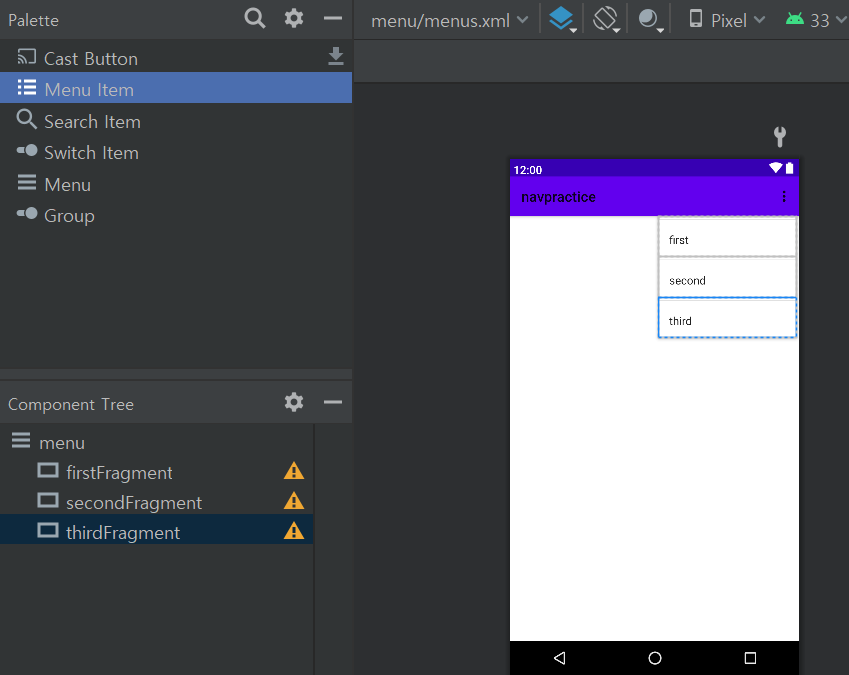 그렇게 만들어진 xml 파일에서 fragment들을 생성한다. 나는 first, second, third라는 텍스트뷰가 있는 fragment 3개를 만들었다.