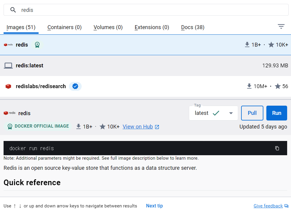 가장 먼저 도커 허브에서 redis를 검색하여 official image의 가장 최신 버전 이미지를 검색한다.