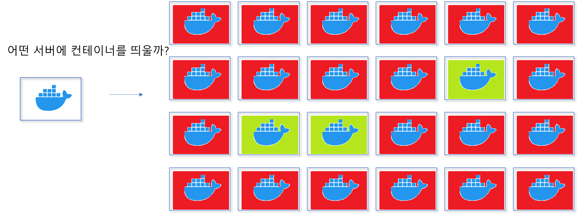 빨간색이 이미 컨테이너를 실행 중인 서버라고 하고 초록색이 실행 중이 아닌 서버라고 하면 초록색을 찾아서 컨테이너를 듸워야 한다.