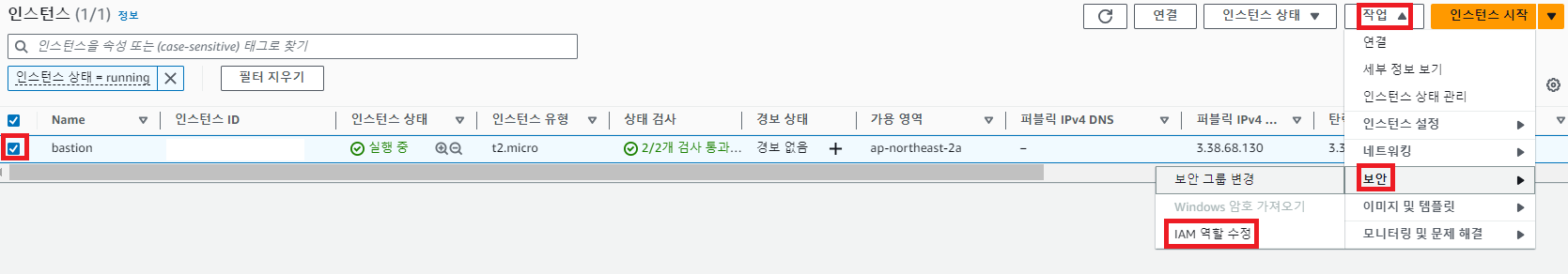 EC2 인스턴스에 들어가서 IAM 역할을 수정한다.