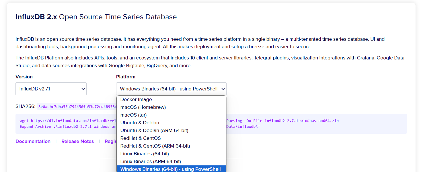 InfluxDB에서 Platform을 Windows로 선택한다.