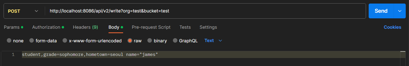 request body에는 text/plain 형식으로 쿼리문을 작성하는데 INSERT 부분을 제외하고 넣으면 된다.