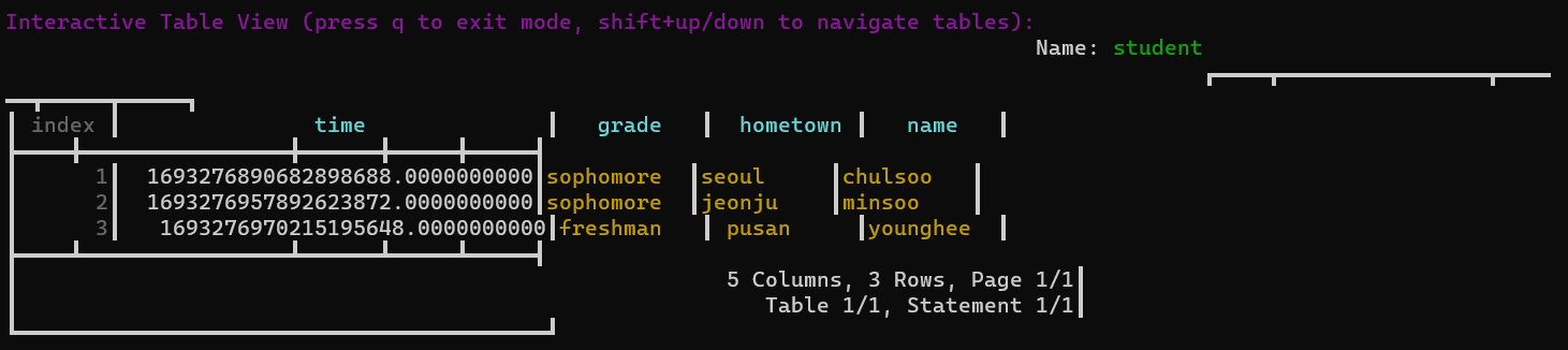 값을 삽입하고나서 다시 CLI로 SELECT 쿼리를 날려서 잘 적용되었는지 확인해보자.