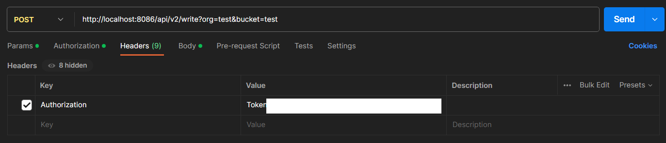 그리고 organization과 Bucket(데이터베이스), Timestamp precision의 경우는 url에 query string으로 넣는다.