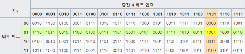 6비트가 4비트로 바뀌는 S-box는 다음과 같은 테이블을 사용한다.