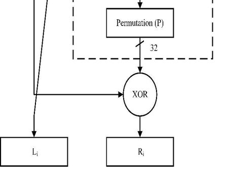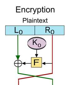 이 구조를 요약하자면 서브 키 K(i)를 사용하여 R(i)에 라운드 함수 F를 적용한다.