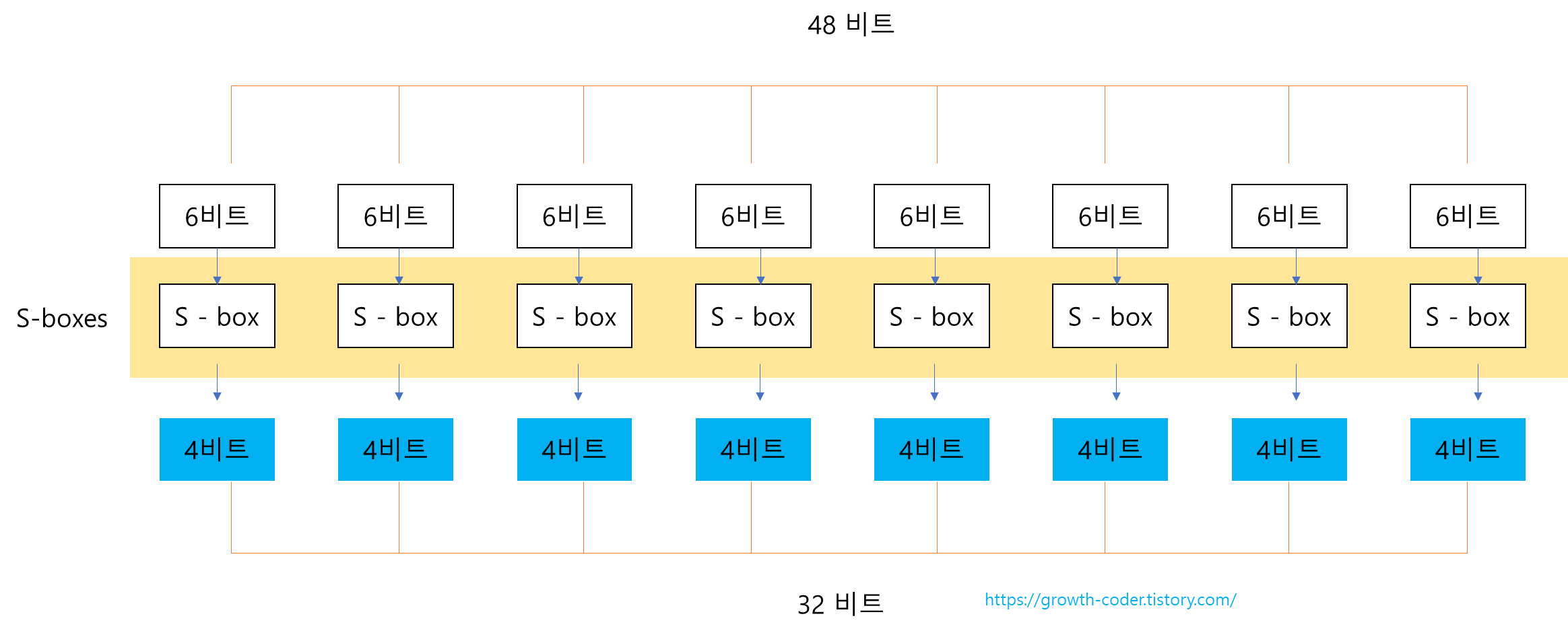 이 과정은 다음과 같이 총 8개의 S-box에 비트가 나누어서 들어간다.