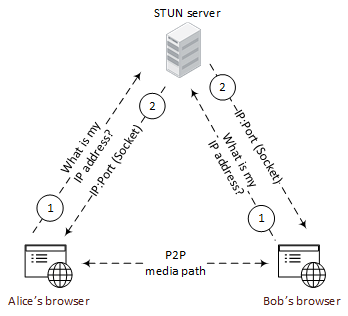 우선 연결을 하려는 두 peer가 STUN server로부터 public IP 주소를 받고 private IP 주소와 함께 TURN server로 보낸다.