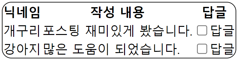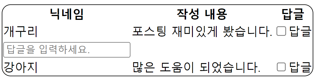답글 기능을 구현할 때 메시지들을 단순히 ul 안의 li로 구성한다거나 div로 구현한다면 간단하게 구현할 수 있겠지만 테이블 형식으로 메시지에 대한 정보를 보여줘야 했기 때문에 table을 사용하여 구현하였다.