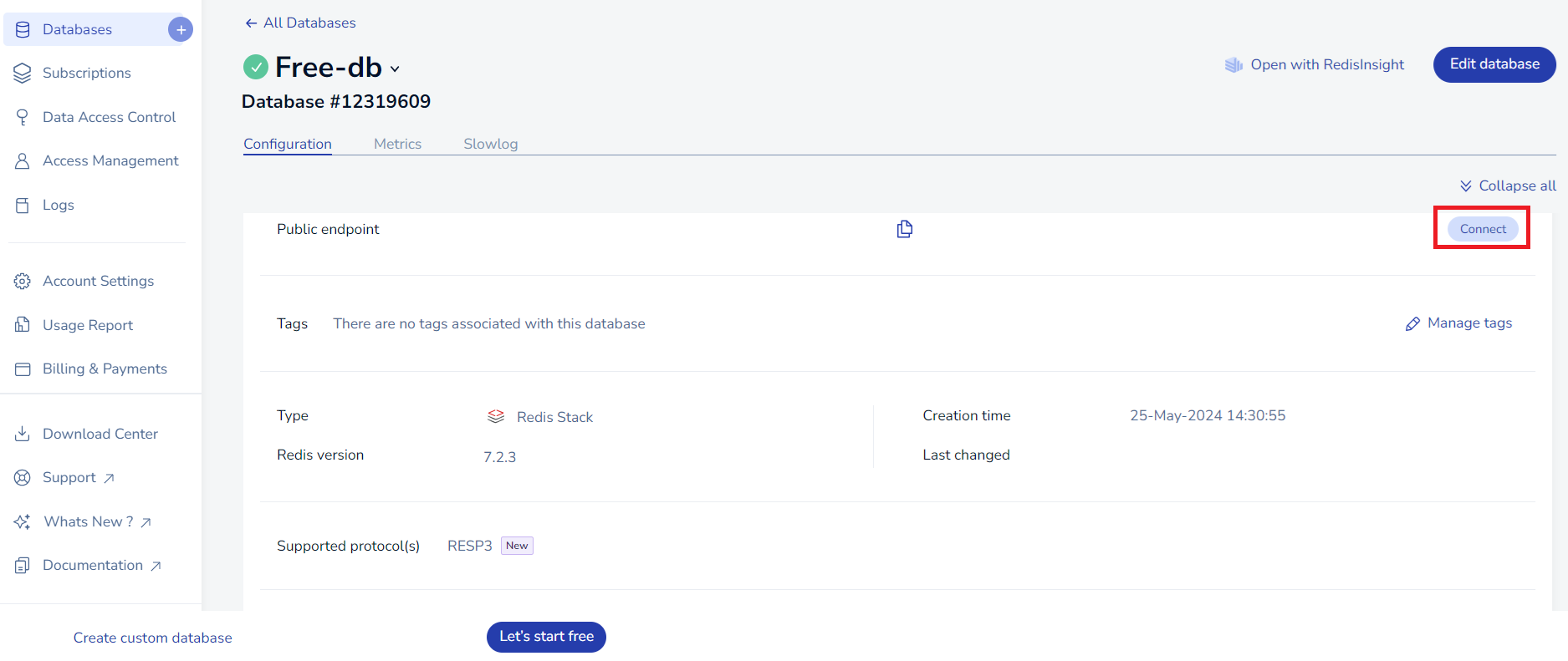 Let's start free 버튼을 누르면 데이터베이스가 생성된 것을 확인할 수 있다.