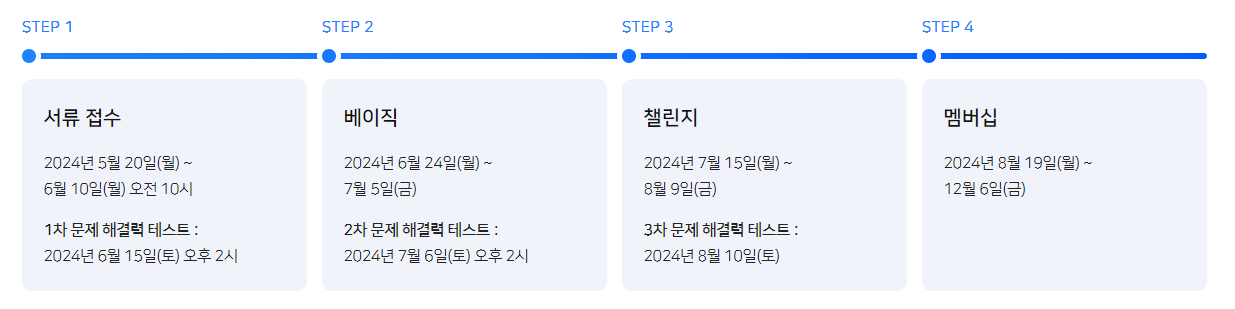 1차 문제 해결력 테스트 -> 베이직 과정 -> 2차 문제 해결력 테스트를 거쳐 챌린지 과정에 선발됩니다.