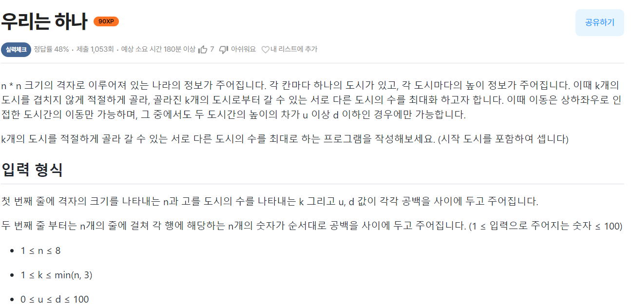 문제를 보면 도시의 최대 개수는 8 x 8 = 64개이고 고를 도시의 최대 개수는 3이다.
