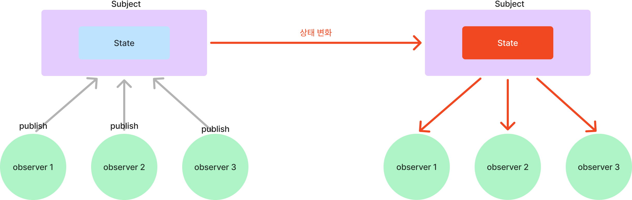 observer들은 단순히 주체를 구독하기만 하면 주체는 객체의 상태가 변경될 때마다 알림을 받을 수 있다.