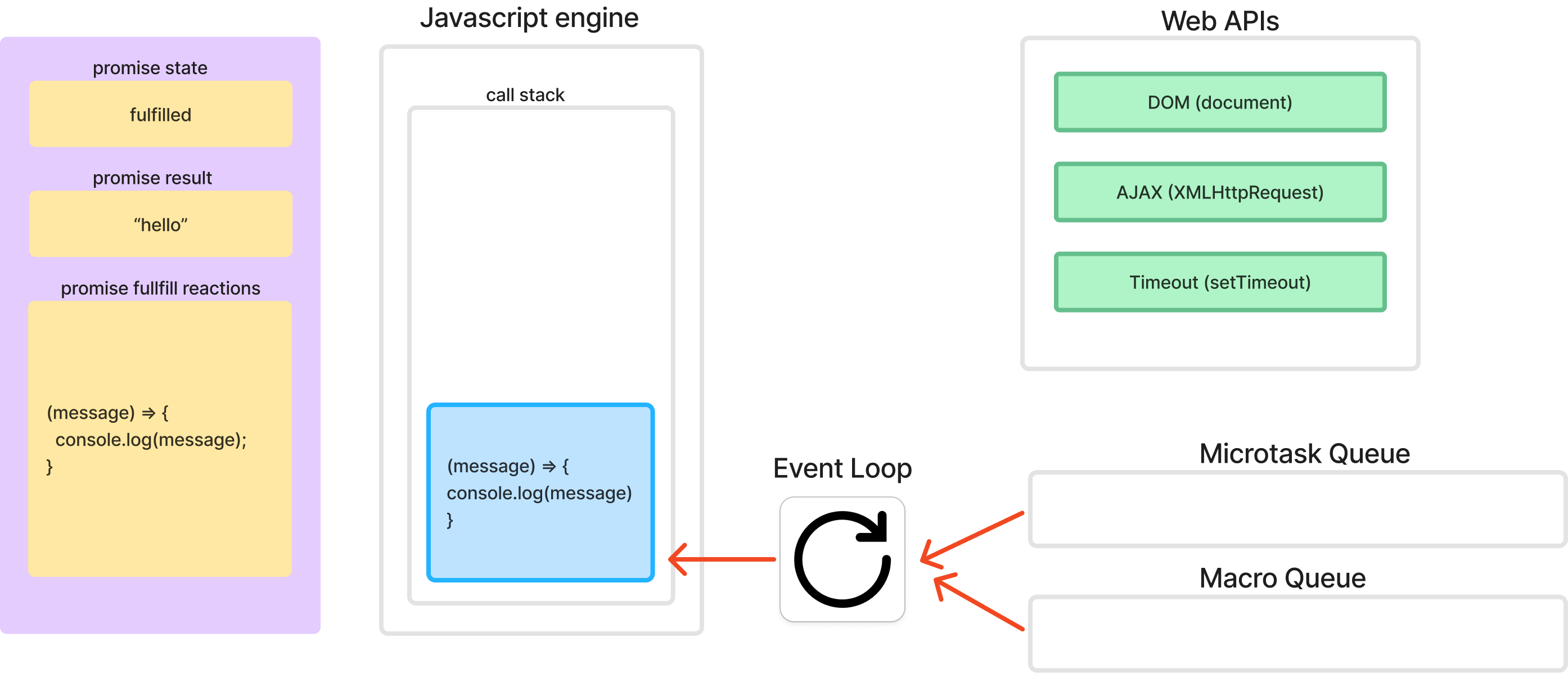 - promise fulfill reactions에 등록된 함수가 call stack으로 올라간다.