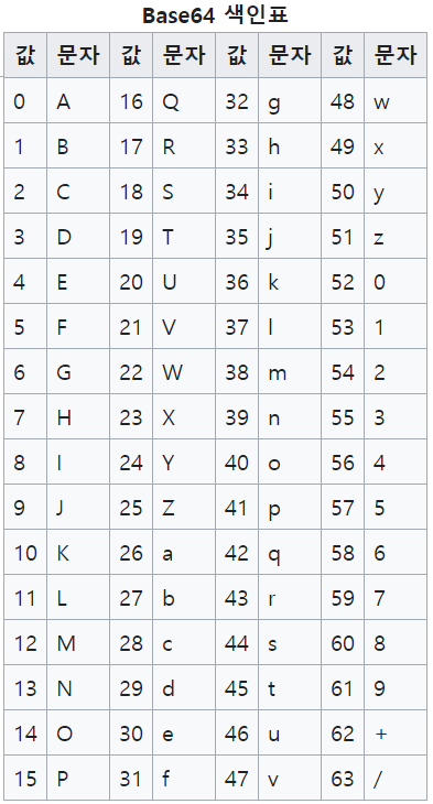 base64 인코딩을 진행할 때 Base64 색인표를 사용한다.