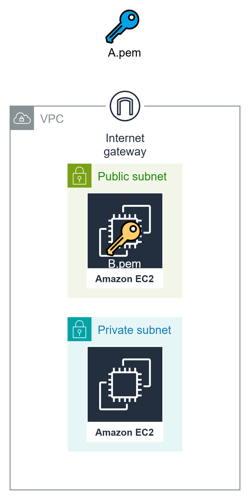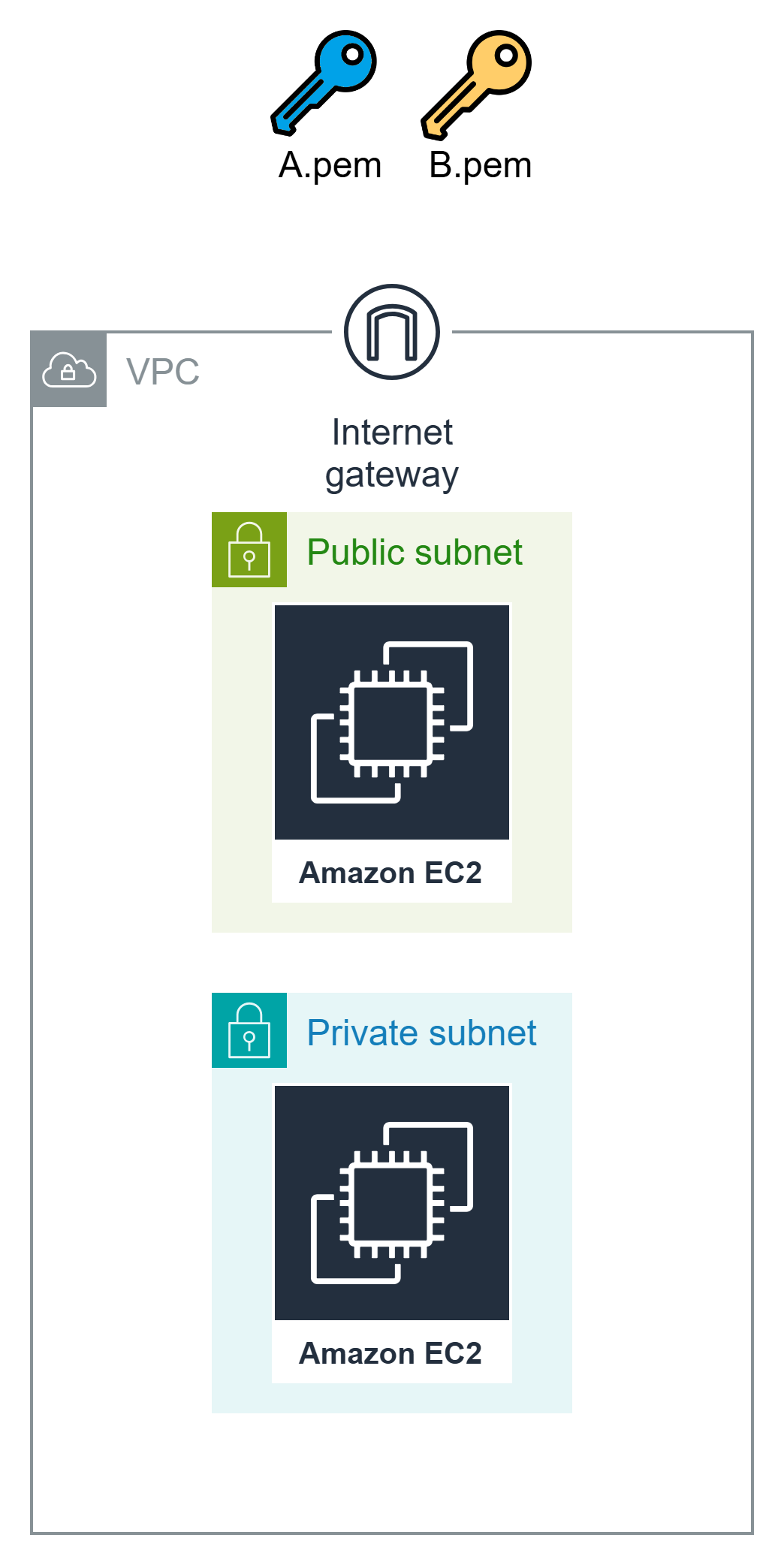Bastion Host에 접근할 수 있는 키 파일을 A.pem이라고 하고 private EC2에 접근할 수 있는 키 파일을 B.pem이라고 하자.