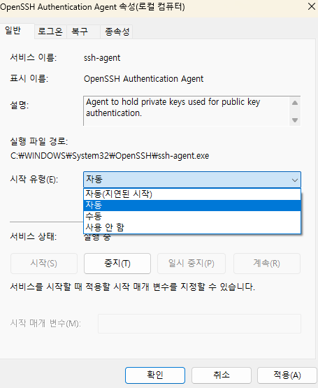 만약 자동으로 설정되어 있지 않다면 우 클릭 후 속성에 들어가서 시작 유형을 자동으로 바꿔준다.