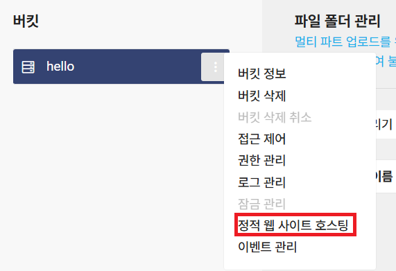 Object Storage에서정적 웹 사이트 호스팅을 하려면 버킷을 생성한 후 정적 웹 사이트 호스팅을 하면 된다.