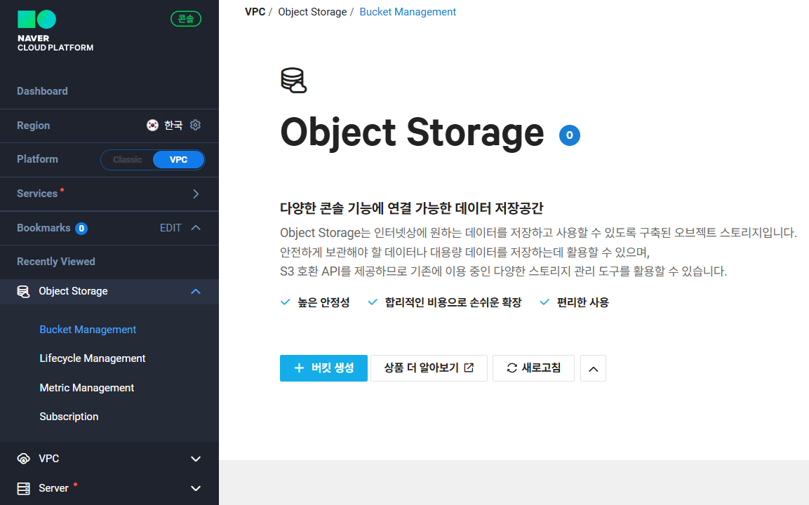 서비스 -> Storage -> Object Storage에 접속한다.
