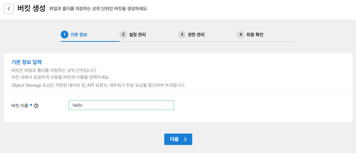 버킷이란 객체를 저장하는 공간이고 Object Storage를 사용하기 위해서는 하나 이상의 버킷이 필요하다.