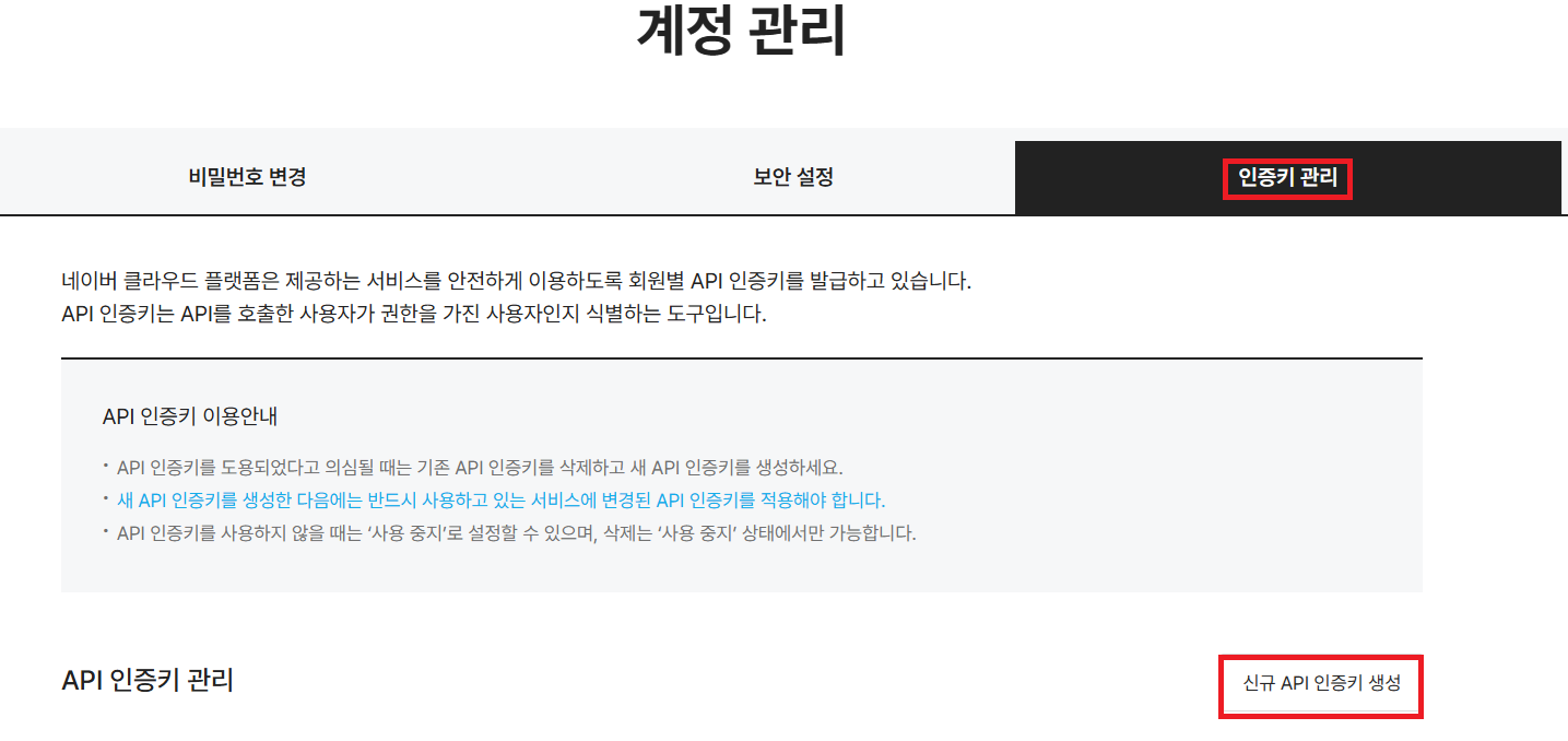 인증키 관리 -> 신규 인증키 생성