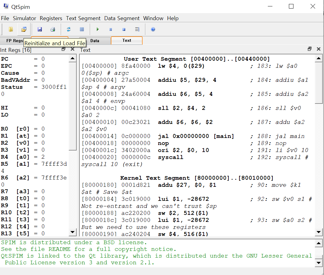 spim simulator를 실행하면 위와 같은 화면이 뜨는데 좌측 상단에 load file을 눌러서 어셈블리 코드를 실행해볼 수 있다.