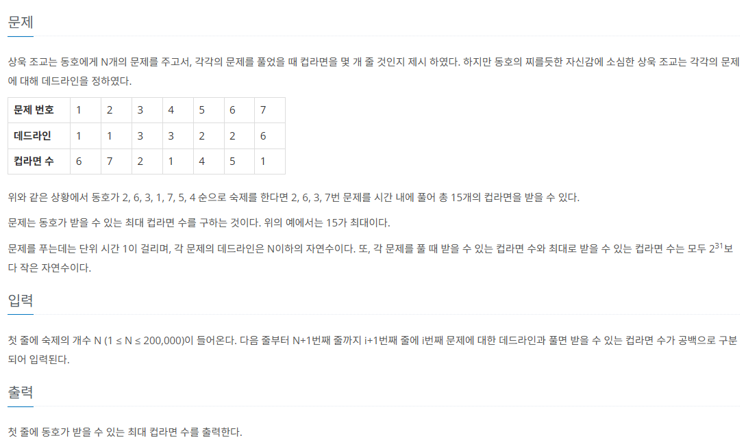 * 데드라인이 1일 때 1인 문제를 풀고 2일 때 2인 문제를 풀어야 최적의 해가 된다.