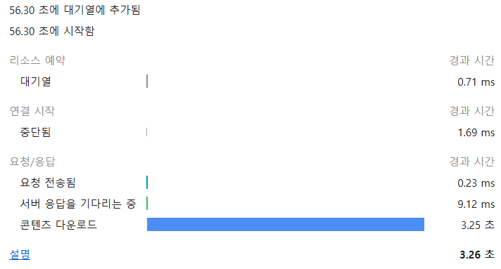 TTFB(Time To First Byte)가 3310ms에서 9ms로 감소하였습니다.