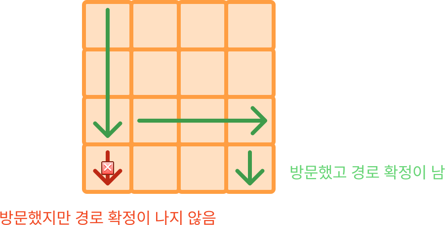 여기서 방문했다는 뜻은 DFS + 백트래킹 기법으로 이미 방문 한 곳을 의미하고 경로가 확정났다는 뜻은 해당 칸에서 도착 지점까지 갈 수 있다는 것을 의미합니다.