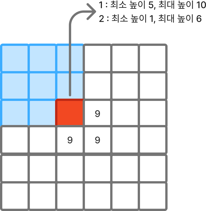 그리고 그 칸에서 갈 수 있는 모든 칸의 높이가 9라고 해보자.