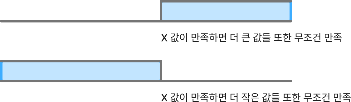 바로 어떠한 값이 조건을 만족한다면 그보다 큰 값 혹은 작은 값들 또한 모두 조건을 만족한다는 조건이 필요하다.