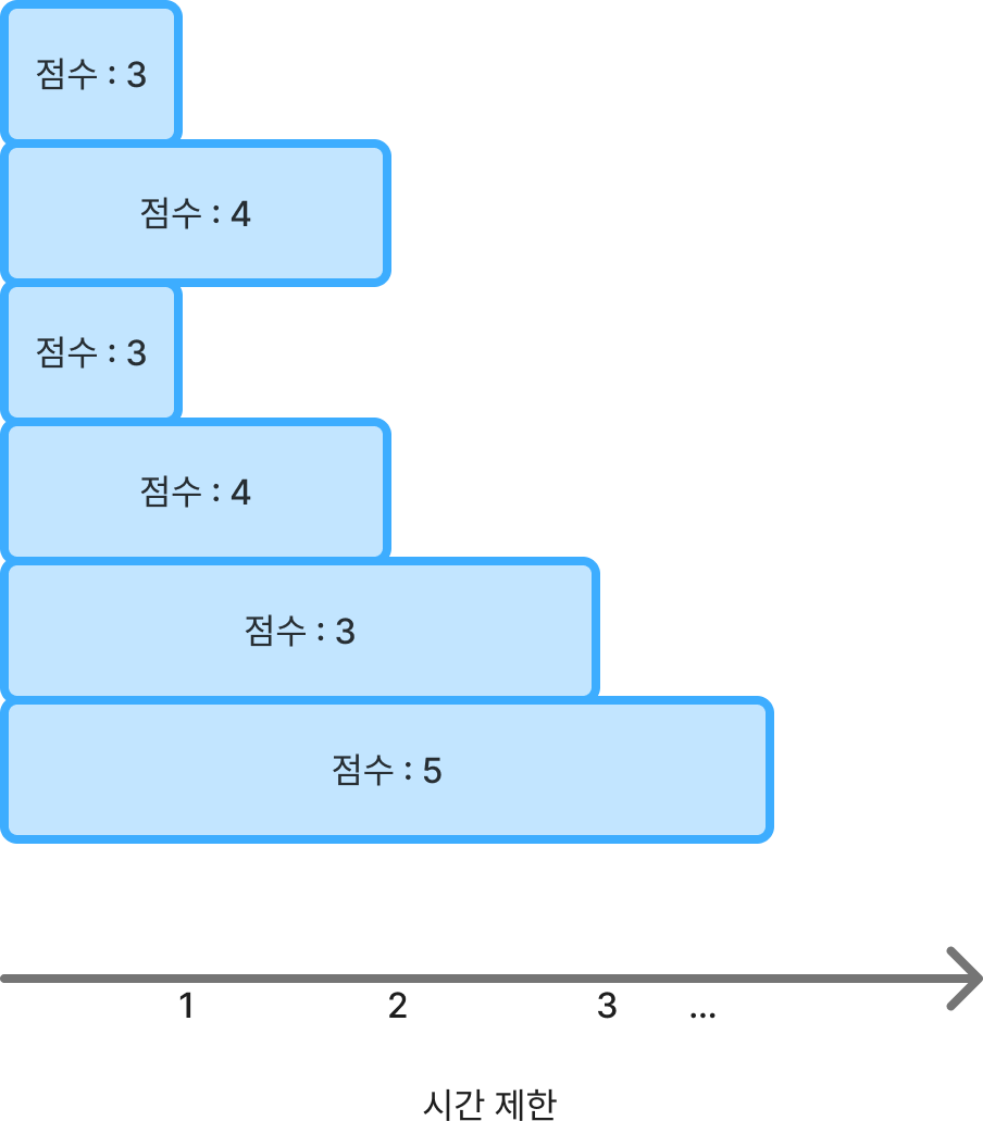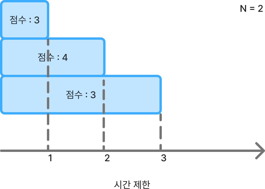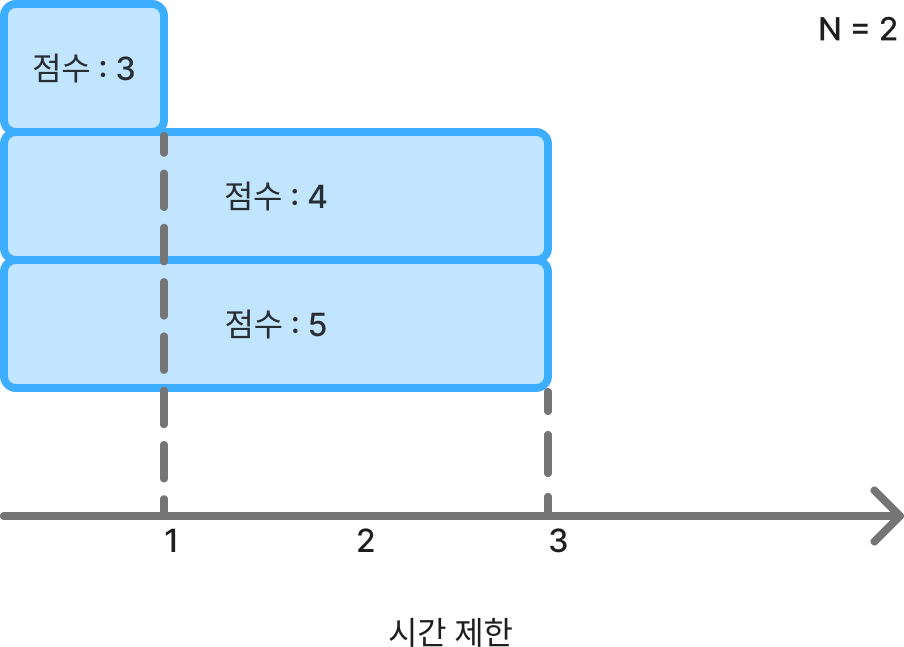 다음과 같이 N이 2이면서 (시간 제한, 점수) 쌍이 (1, 3), (3, 4), (3, 5)인 경우를 생각해봅시다.