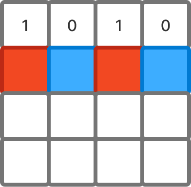 첫 번째 행의 값들을 모두 1로 만들기 위해서는 빨간색 칸은 절대 누르면 안 되고 파란색은 칸은 반드시 눌러야 합니다.