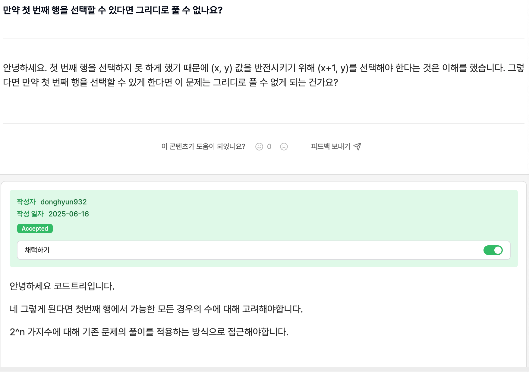 이 때, brute force 방식을 적용하여 첫 번째 행의 모든 칸들의 값을 고정하면 greedy를 적용할 수 있게 됩니다.