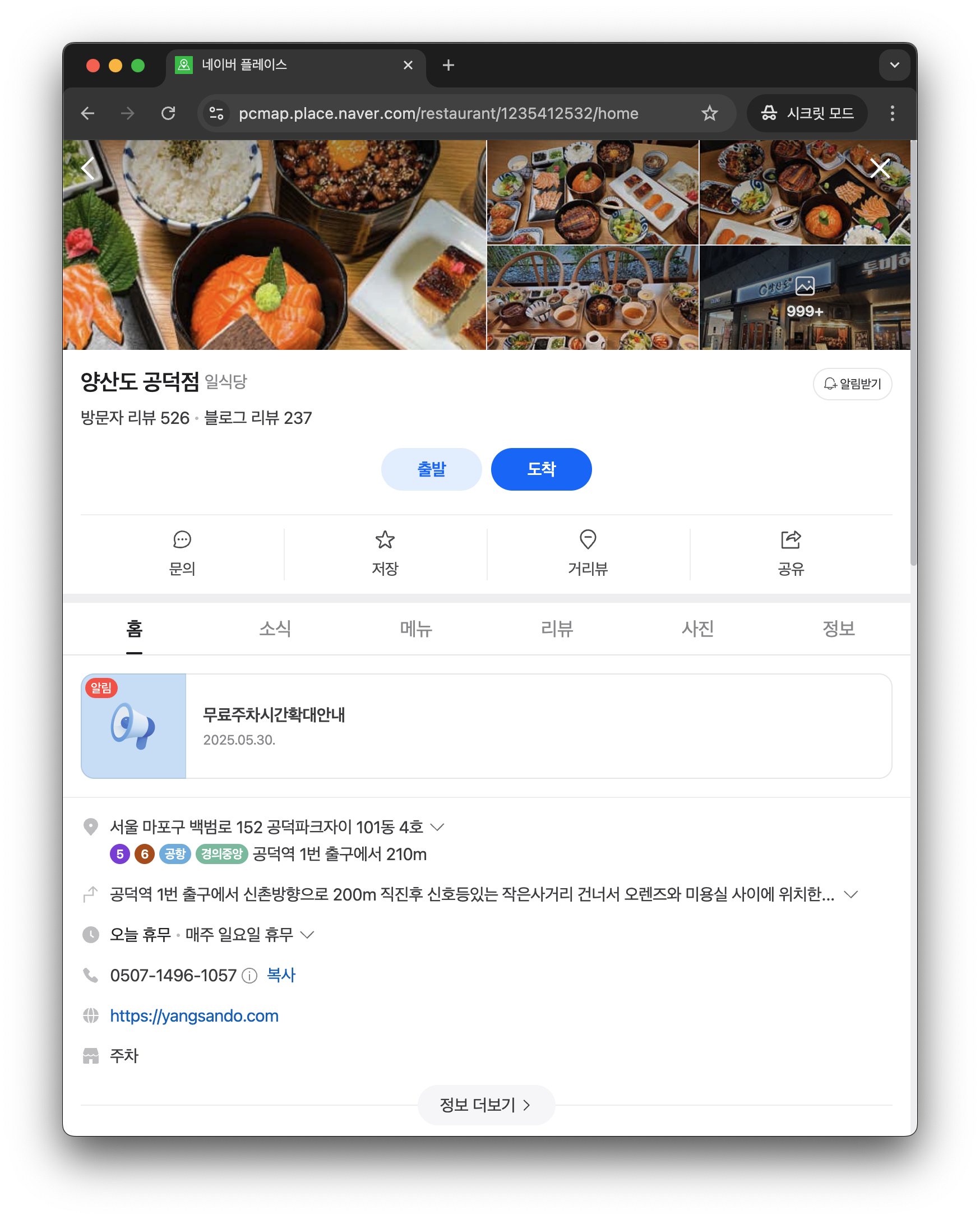 또한 식당을 클릭하여 새로운 창이 열리면 여기서 식당 상세 정보를 확인할 수 있습니다.