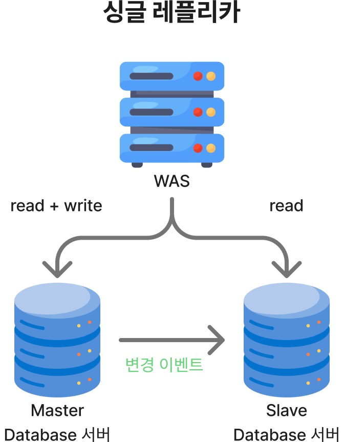 WAS는 Master DB에 write 연산과 read 연산을 하고 Slave DB에는 읽기 연산만 하는 구조입니다.
