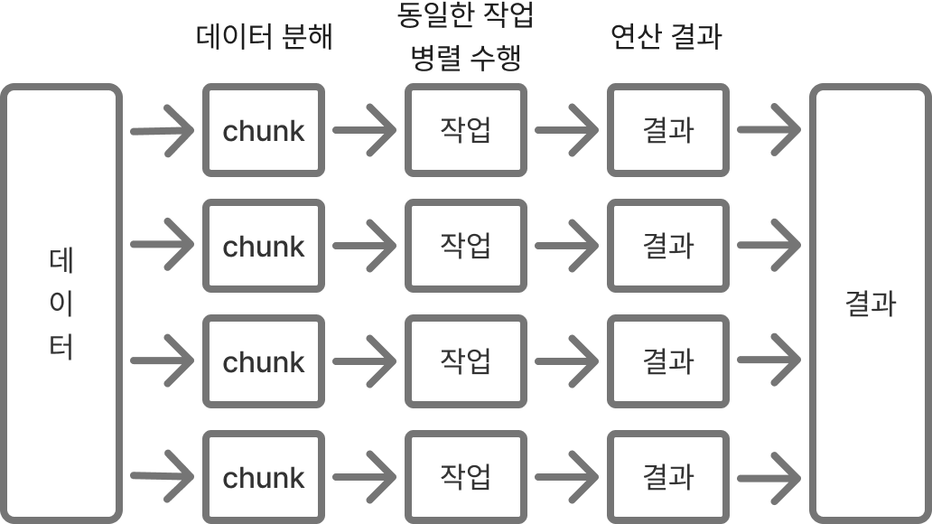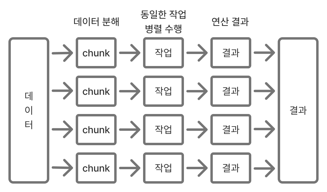 데이터 분해는 데이터를 chunk라는 여러 개의 단위로 나눈 다음 각 chunk에 대한 연산을 병렬로 실행한다.