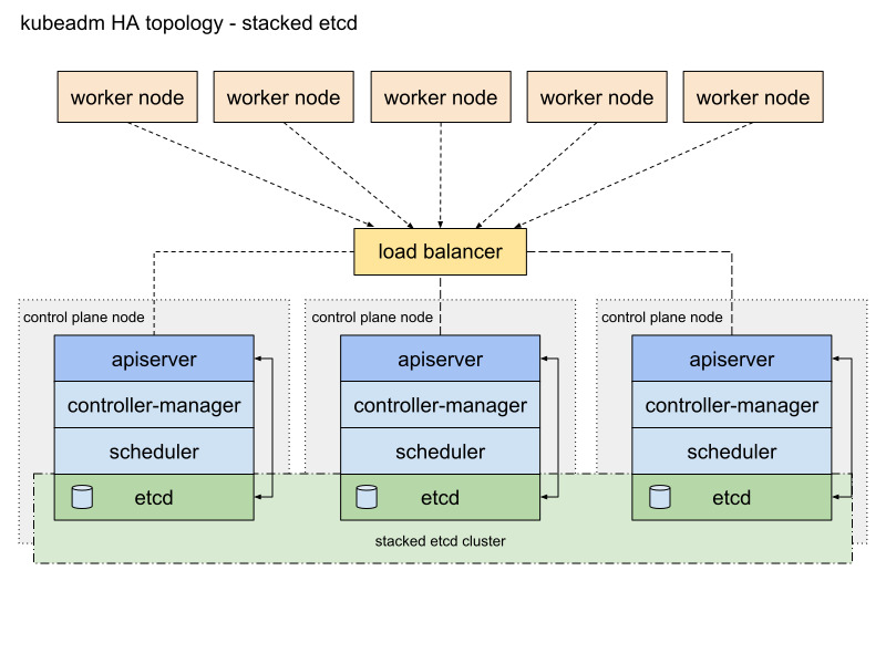 etcd가 각 control plane node 안에 존재한다면 stacked etcd topology이며 etcd cluster가 외부에 존재한다면 external etcd topology입니다.