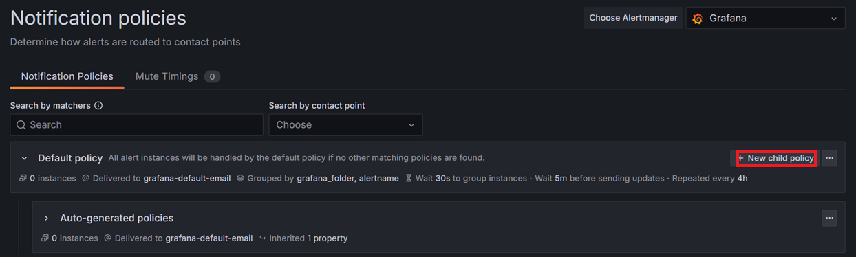 - Matching labels: notification policy를 적용할 alert rule의 label
