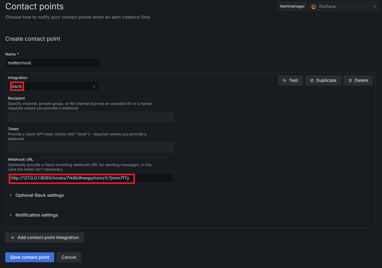 mattermost에서 incoming webhook을 설정하고 URL을 contact point로 등록했습니다.