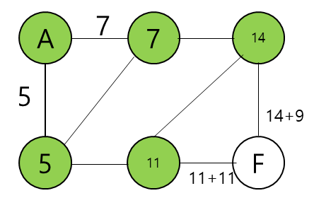 최단 경로는 A-C-D-F이고 최단 거리는 22이다.