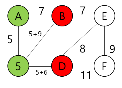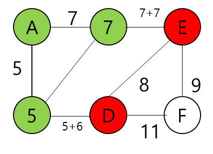 이제 B의 최단경로는 A-B이고 거리는 7임을 확정할 수 있다.