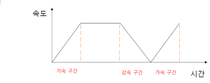 돌다가 멈추고를 반복하기 때문에 가속 구간과 감속 구간이 존재한다.